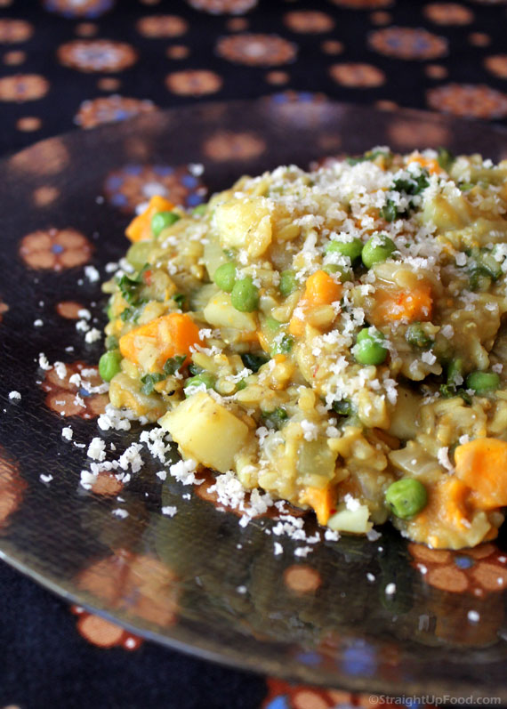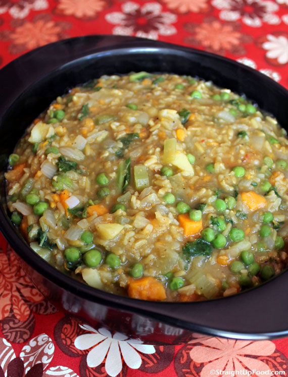 Khichadi (pronounced kich-ah-ree) is an Indian comfort food that features rice and lentils. This recipe also calls for a variety of spices that will fill your kitchen with a wonderful aroma! This hearty dish is not short on ingredients, so please see Notes below for time-saving variations.