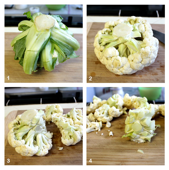 (1) Turn the cauliflower upside down. (2) Remove the thick outer leaves (the leaves are also edible, but are most often discarded). (3) Cut down along the thick inner core until all the florets are free. (4) Now you are left with just the core, separated perfectly from the florets, and no waste. Cut florets smaller from here.